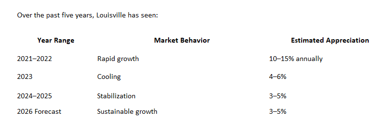 Louisville home prices are projected to appreciate 3–5% in 2026, reflecting a balanced and sustainable market. Inventory has increased slightly, giving buyers more options, while new construction growth continues in suburban areas. The market is no longer overheated, but it remains competitive in high-demand neighborhoods.